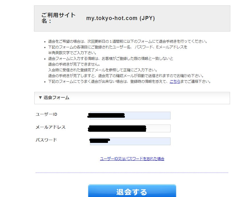 退会フォームにてユーザーID,パスワード、登録したメールアドレスを入力して「退会する」ボタンをクリックして退会手続きは終了です。
