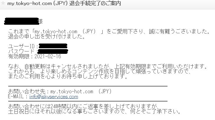 東京熱(TOKYOHOT)退会後は退会完了メールが届くのみで、迷惑メールが来る事は無いです。
