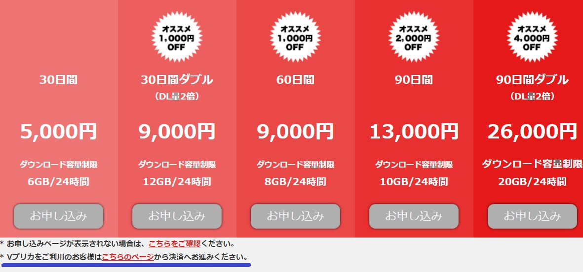 Vプリカ専用の決済ページでは5%割引きクーポンが使えないので、「こちらのページ」には進まずに、そのまま希望するプランの「お申込み」をクリックして進んだほうが良いでしょう。